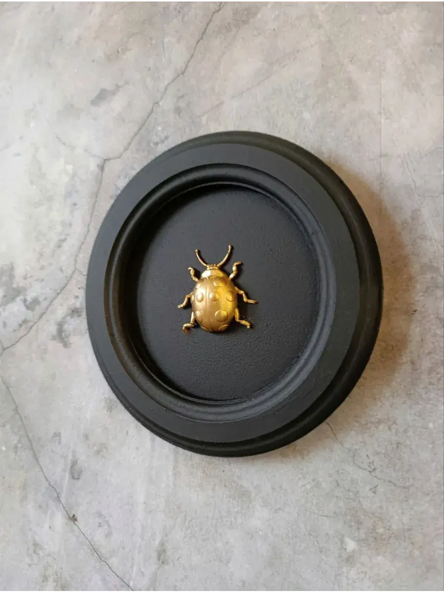 Интерьерное панно «Божия коровка» ручной работы, выполненное в черно золотой цветовой гамме, станет изысканным акцентом в вашем доме или офисе. Его диаметр составляет 18 см, а высота — 2 см, что позволяет ему гармонично вписаться в любое пространство. Панно отличается эффектным дизайном: золотые элементы на черном фоне придают ему уникальность. Изготовленное из качественного материала МДФ, известного своей прочностью и долговечностью, оно покрыто черной краской, золотой поталью и акриловым лаком. Этот аксессуар добавит изысканный штрих в современный или классический интерьер, преображая ваше пространство на новый уровень элегантности. Идеальный подарок для ценителей оригинальных и стильных предметов декора! Установите его в гостиной, спальне или на рабочем месте, чтобы создать атмосферу роскоши и шарма. Это панно на стену с насекомыми — оригинальное украшение ручной работы, созданное с душой. Божия коровка в рамке. Украшение на стену золото. Панно на стену Божия коровка.