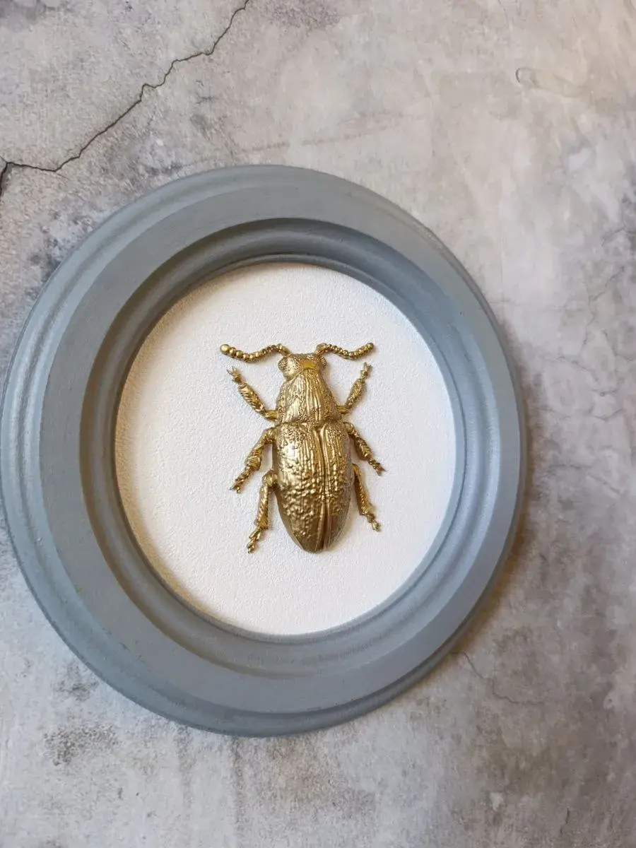 Интерьерное панно «Жук» ручной работы, выполненное в серо-белой золотой цветовой гамме, станет изысканным акцентом в вашем доме или офисе. Его диаметр составляет 18 см, а высота — 2 см, что позволяет ему гармонично вписаться в любое пространство. Панно отличается эффектным дизайном: золотые элементы на белом фоне придают ему уникальность. Изготовленное из качественного материала МДФ, известного своей прочностью и долговечностью, оно покрыто серой и белой акриловой краской, золотой поталью и акриловым лаком. Этот аксессуар добавит изысканный штрих в современный или классический интерьер, преображая ваше пространство на новый уровень элегантности. Идеальный подарок для ценителей оригинальных и стильных предметов декора! Установите его в гостиной, спальне или на рабочем месте, чтобы создать атмосферу роскоши и шарма. Это панно на стену с насекомыми — оригинальное украшение ручной работы, созданное с душой. Жук в рамке. Украшение на стену золото. Панно на стену Жук.